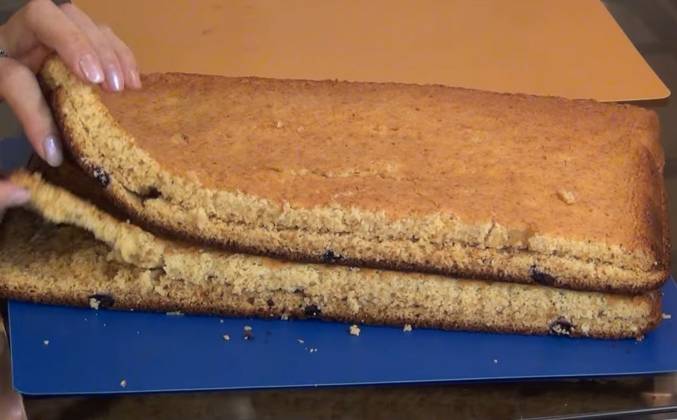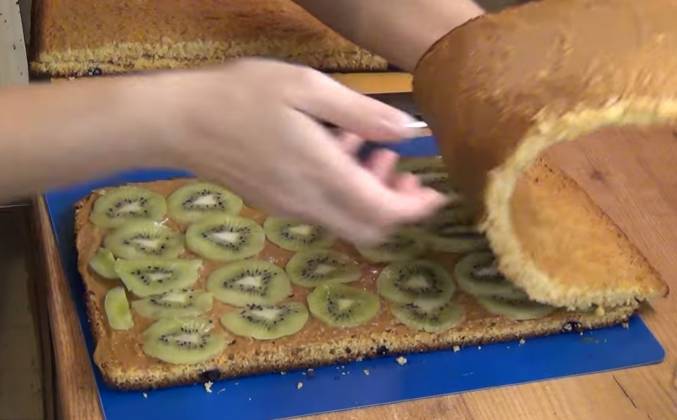 3. Сверху будет мастика из маршмэллоу и сахарной пудры. Сахарную пудру сами сделаем из сахара. Сначала разрежем бисквит пополам. Это будет прямоугольный торт. Бисквит получился воздушный и нежный. Желательно бисквит разрезать вдоль, чтобы получилось 4 части. У меня получилось 4 части. Приготовим крем. Перекладываем в стаканчик сгущёнку. Добавляем подтаявшее сливочное масло. Берём блендер с многофункциональной насадкой. Делаем однородную массу. На крем ушло 2 банки сгущёнки и 180 г сливочного масла. Приступаем к составлению торта. Берём нижний корж. Смазываем кремом. Кто любит, чтобы в торте было много крема, добавляет его побольше. Готово. Берём фрукты. Нарезаем киви тонкими кружочками. Выкладываем киви на поверхность крема. Верхнюю часть первого слоя тоже смазываем кремом.