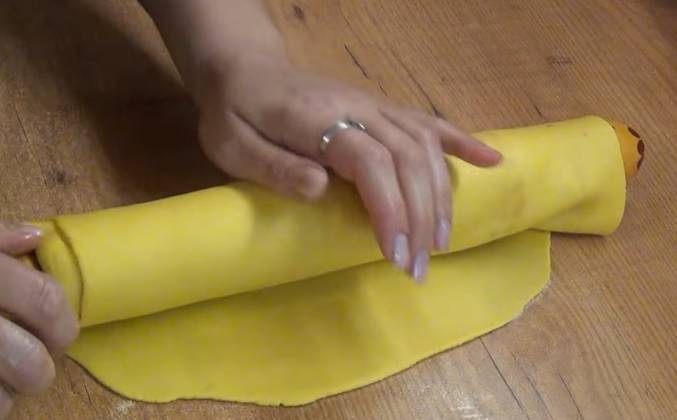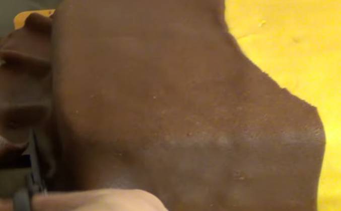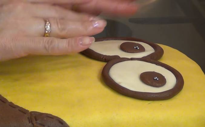 6. Делим мастику на три части. Одна будет маленькой, две побольше. Достаточно. Смешиваем. Покрываем торт мастикой. Для того, чтобы мастика не пересыхала держим её в пакетах. Берём мягкую жёлтую мастику. Будем жёлтой мастикой покрывать 2/3 торта. Смазываем руки и скалку маслом. Раскатываем мастику, как тесто. Переносим мастику на торт. Делаем это при помощи скалки. Выравниваем. Берём мастику коричневого цвета. Разминаем. Смазываем руки маслом. Можно смазать маслом стол. Раскатываем. Коричневую мастику помещаем на нижнюю часть торта. Ровные края подворачиваем.