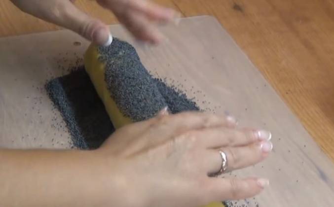 2. У нас получается такое мягкое эластичное тесто. Делим тесто на две части. Раскатываем тесто на "колбаски". Примерно такого размера. Берём пищевую плёнку. Плотно заворачиваем в неё тесто. Убираем тесто в морозильную камеру на 30-40 минут. Тесто подмёрзло. Снимаем плёнку. Высыпаем мак на ровную поверхность. Вдавливаем тесто в мак. Нарезаем тесто на заготовки толщиной 5 мм.