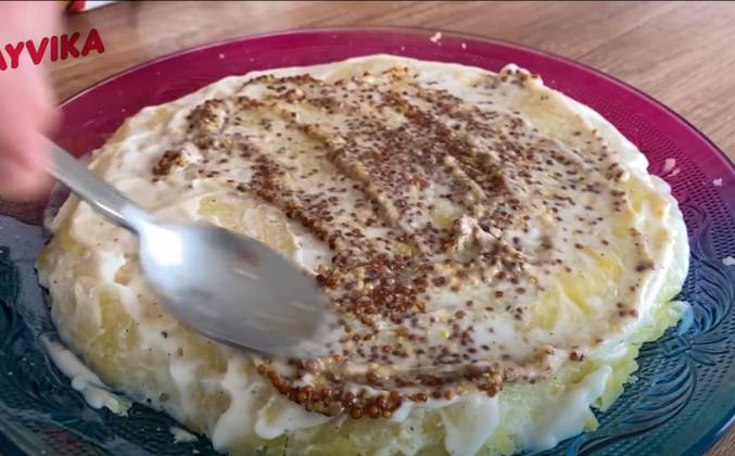 2. Куриное филе нарезаем соломкой 3 отварных или запеченных картофеля крупно натираем. Делаем ровный слой из картофеля. Немного соли и перца и слой майонеза. Майонез домашний без яиц? 1 ложка французской горчицы. Добавляем порезанное куриное филе. Снова добавляем майонез.