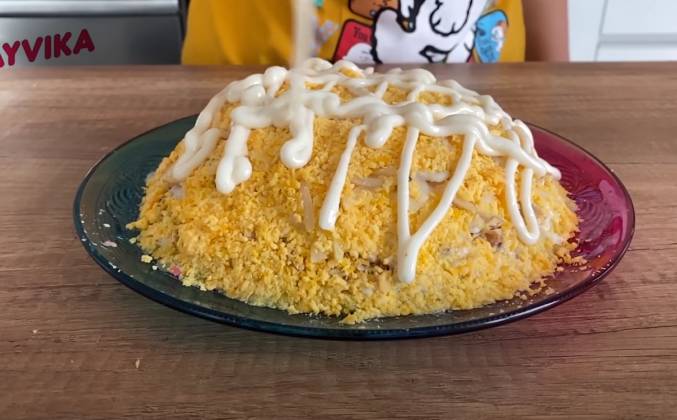 3. Маринованный лук 4 вареных яйца, отделяем желток от белка. Натираем 4 желтка и распределяем по салату. Слой майонеза. Натираю 100 грамм твердого сыра. Слой майонеза. Натираем крупно белок от яйца - это наш последний слой салата. Украшаем мандарином и тмином. Поставим на 2 часа в холодильник. Приятного аппетита!Видео рецепт ютуб ниже 👇