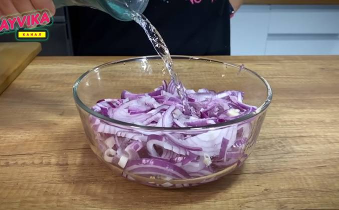2. Режем 500 грамм отварного мяса 300 грамм маринованных огурчиков и порежем их соломкой 200-300 грамм маринованных грибов. Добавляем маринованный лук, немного чёрного молотого перца и соли.