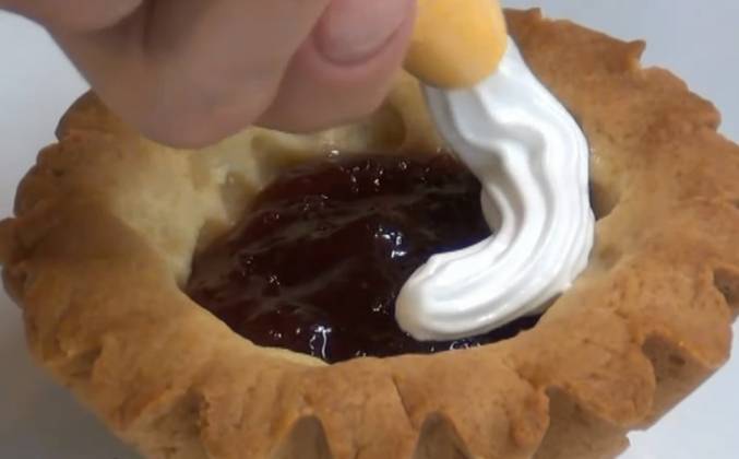 3. Можно готовность проверить термометром - сироп должен нагреться до 120 градусов. Также готовность сиропа можно проверить при помощи миски с холодной водой. Пока варится сироп, я быстро буду взбивать белки. Один белок у меня есть, отделяем от желтка второй. Чтобы белки легко взбивались, я добавлю немного соли. Взбиваем миксером. Можно добавить несколько капель лимонного сока. Снова взбиваем в пышную пену. Проверяем температуру. 110, 113, 114, 116... Всё - 120 С. Отключаем нагрев и проверим при помощи холодной воды. Капля сиропа, смоченная в холодной воде, становится как пластилин. Значит наша карамель готова. Ещё немного взбиваем белки миксером. Постепенно тонкой струйкой льём карамель и продолжаем взбивать. Готовый крем перекладываем в кулинарный мешочек. На дно корзиночки добавляем немного повидла или джема. Через фигурную насадку выдавливаем крем. Рисунок придумываем сами. Можно украсить ягодами. Мои Корзиночки с белково-заварным кремом готовы!Видео рецепт ютуб ниже 👇