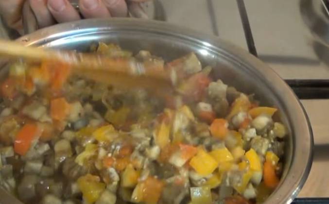 2. Можно использовать репчатый лук. Обжариваем лук до прозрачности, периодически помешивая. Пока обжаривается лук, нарезаем кубиками сладкий перец. Лук уже зарумянился. Стрелка на кастрюле с рисом дошла до середины зелёного поля. Отключаем нагрев у риса и оставляем под закрытой крышкой на 15 минут. Добавляем к луку перец. Уменьшаем нагрев до минимального. Нарезаем кубиками помидоры. Отжимаем сок из баклажанов и добавляем их на сковороду. Сока выделилось не много. Добавляем помидоры. Можно немного посолить и поперчить. У меня получилось много овощей. Крышкой накрыть не получится. Накрываем комби-миской. Откручиваем с крышки термоконтроллер, снимаем предохранительное кольцо и устанавливаем на комби-миску.