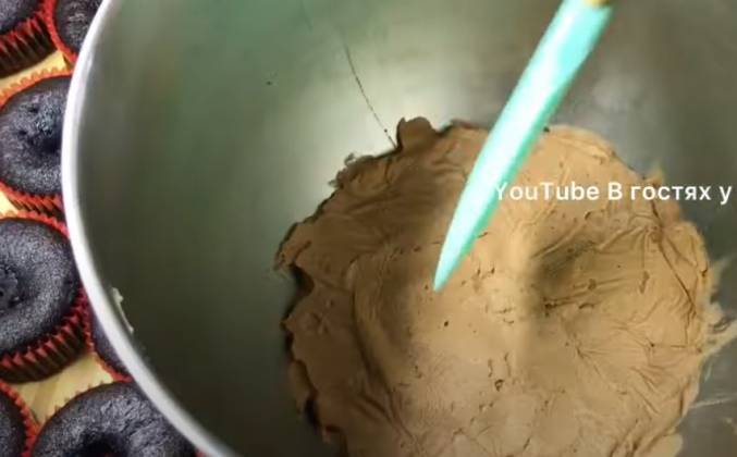 3. Когда все соединила добавляю растопленное тёплый шоколад. Шоколад нужно растопить в микроволновке или на водяной бане. Если вы будете растапливать шоколад в микроволновке делайте это короткими импульсами по 15 секунд чтобы шоколад не горел. Тёплый шоколад вливаю в крем и перемешиваю . Готовый крем убираю на 20 минут в холодильник и можно украшать кексы. Крем про будет чуть больше в холодильнике ничего страшного он очень быстро отходит при комнатной температуре. Приятного аппетита Вам, готовьте с удовольствием!Видео рецепт ютуб ниже 👇