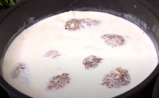 3. Так обжариваем все котлеты. Берем небольшую кастрюльку, отлично подойдет с антипригарным покрытием. Наливаем сливки 400 мл, чем жирнее тем лучше, у меня сегодня жирностью 20%, нагреваем и добавляем плавленый сыр 150 грамм, как сыр расплавится добавляем обжаренные котлеты, огонь делаем минимальный, закрываем крышкой и томим 25 минут.