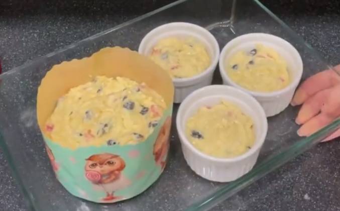 2. Заполнить формы тестом 2/3 от объема. Если у вас форма металическая, то на дно лучше положить пергамент. Для бумажных не нужно. Выпекать 45-60 минут (зависит от размера). Проверяем готовность деревянной шпажкой. Остудить куличи на решетке, через часа 2 можно вынимать из формы. Желатиновая глазурь: Желатин развести в холодной воде за 10 минут. В сотейнике с толстым дном соединить сахар, сок лимона и воду. Не перемешивать.