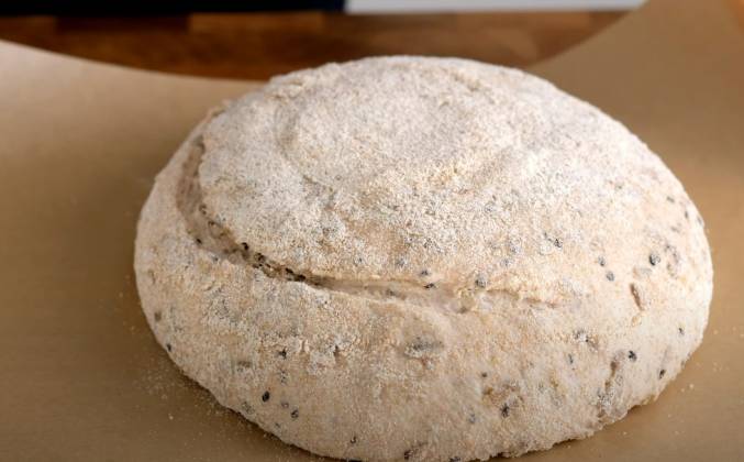 2. Присыпьте цельнозерновой мукой форму для расстойки (или миску застеленную полотенцем). После 60 минут расстойки округлите тесто, путем складывания краев теста к центру, положите в форму швом в верх и оставьте еще на расстойку на 60 минут. После расстойки выложите тесто на противень, застеленный пергаментом и сделайте надрез. Перетяните вместе с пергаментом на горячий противень в заранее разогретую духовку до 230 - 250 C.