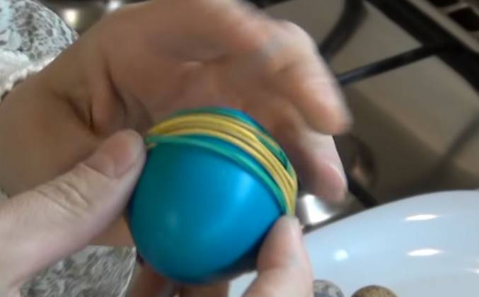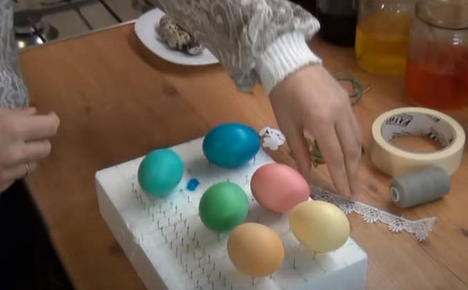 2. Выкладываем яйцо на подставку, которую я специально подготовила. Из иголок. Розовое. Подальше друг от друга. Яйца подсохли. Будем их украшать при помощи подручных материалов. У меня есть вот такая ажурная ленточка. Накладываем её на яйцо. Вот так. Лишнее отрезаем, если есть. Берём капрон. Чтобы ленточка не скользила, фиксируем её при помощи капрона. Натягиваем. Перекручиваем и завязываем ниткой. Смотрим, чтобы под капроном рисунок оставался ровным. Вот так примерно выглядит. У нас получится такое ажурное яйцо. Зафиксировали. Лишнее отрезали. Срезали капрон. Окунём его в синий цвет. Где у нас синий? Подержим там 5 минут. Следующее. Возьмём зелёное.