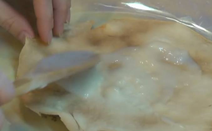 2. У меня получилось мягкое и эластичное тесто, которое не прилипает к рукам. Тесто готово! Берём миску и делим тесто на 10-20 частей. Это будущие слои нашего торта. Поэтому я беру вот такие шарики и складываю их в миску. У меня получилось 20 "теннисных" шариков. Значит в торте будет 20 слоёв. Накрываем крышкой и убираем тесто в холод на 1 час. Для заварного крема нам понадобятся: 1 литр молока, 400-500 г сахара, 2 столовые ложки крахмала и 1 яйцо. Наливаем молоко в кастрюлю. Немного молока оставляем в пакете. Добавляем сахар, включаем нагрев и кипятим. В отдельной ёмкости замешиваем крахмал с оставшимся в пакете молоком. Получается крахмальное молочко.