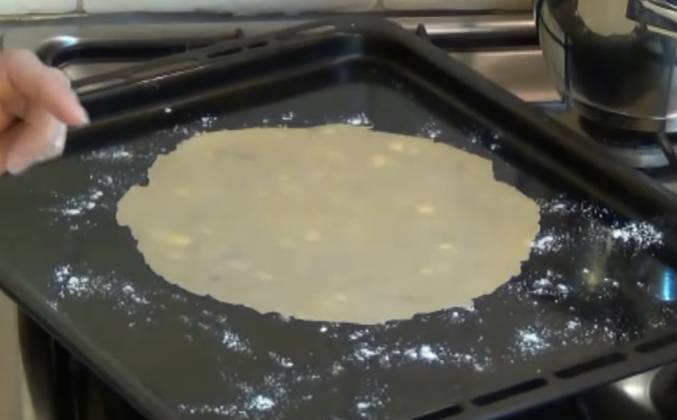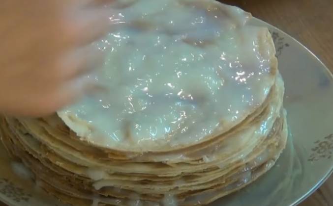4. Выпекаем до золотистого цвета (около 5 минут). Сразу же делаем следующий слой. Первый корж готов. Пока он ещё горячий срезаем всё лишнее. Для этого я использую крышку и нож. Крошки понадобятся для присыпки. Кладём готовый корж на блюдо и сразу же поливаем сверху кремом. Крошки нужно собрать в тарелку. На противень кладём выпекаться новый корж. Снова срезаем края, кладём на первый корж и смазываем кремом. Последний корж смазываем кремом и сверху посыпаем крошкой, которую срезали с коржей. Крошку разминаем руками. Посыпаем густо и на все края. Достаточно. Теперь торт нужно поставить под пресс. Для этого я беру крышку соответствующего диаметра и придавливаю. Сверху ставлю миску с водой - груз. В таком положении торт оставляем на ночь, чтобы он осел. Торт настоялся и осел. Выравниваем края ножом. На края торта наносим крем. Наносим на крем оставшуюся крошку. Мой "Наполеон" готов! Форма у него может быть разная: треугольная, квадратная, круглая... Мне больше нравится круглая.Видео рецепт ютуб ниже 👇