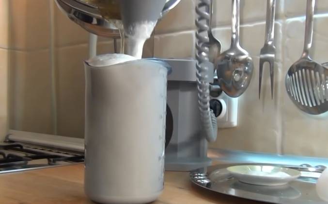 2. Прошло 15 минут. Яблоки протираем через сито. Шкурка остаётся на сито. Получилось яблочное пюре. Перекладываем пюре в стаканчик. Пюре должно получиться по объёму 250-300 мл. Будем готовить сахарный сироп. Ставим миску на медленный огонь. Высыпаем 1 стакан сахара. Сахар начал плавиться. Добавляем в него набухший агар-агар. Перемешиваем и доводим до кипения. Сироп готов. Отключаем нагрев. В яблочное пюре добавляем 1-2 щепотки лимонной кислоты. Добавляем яичный белок. Надеваем на миксер насадку "дисковый взбиватель". Взбиваем на второй скорости. Взбиваем долго, до получения однородной массы. Масса увеличивается в два-три раза. Теперь добавляем второй белок.