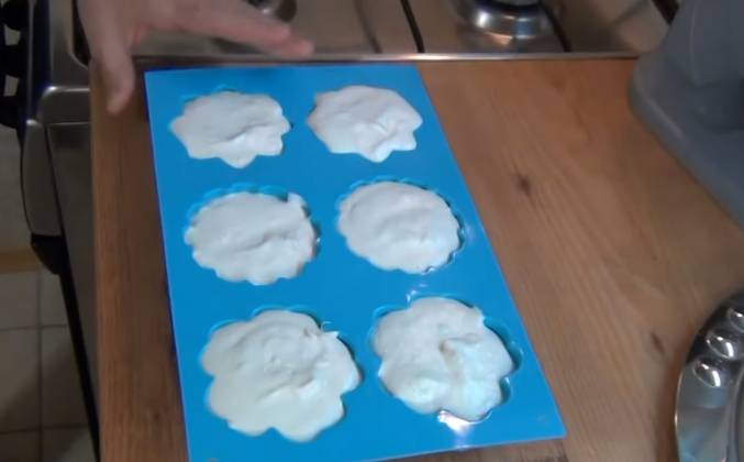 3. Продолжаем взбивать. Получился полный стакан густой пены. Добавляем приготовленную карамель. Постепенно льём и взбиваем. У меня в стаканчик не помещается. Придётся перелить в миску. Всё готово. Очень вкусно. Полученную массу можно выдавить на противень с помощью кондитерского мешочка. Я буду использовать силиконовую форму с разными цветами. Оставляем зефир в форме до полного застывания. Когда он застынет - достаём его и оставляем подсохнуть. В результате получается такой зефир.Видео рецепт ютуб ниже 👇
