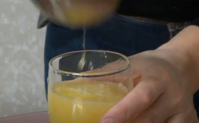 2. Сок подморозился. Теперь его хорошо перемешиваем. До однородной массы. Снова убираем в холод на 40 минут. Такую процедуру повторяем ещё 2 раза. Перемешиваем в последний раз. Получается ледяная масса. Теперь наливаем шампанское.