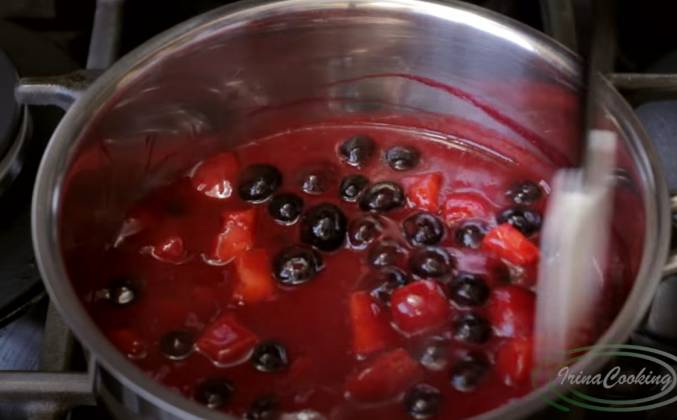 2. У меня получилось 4 порции и я сразу убираю их в холодильник. Замочите еще одну порцию желатина и оставьте набухать. У меня малиновое пюре. Вы можете брать любое, фруктовое или ягодное. Если вы делаете пюре из свежих или замороженных ягод протрите их через сито и добавьте 10% сахара. Еще у меня есть свежая клубника и садовая черника (голубика). Пюре довести до кипения и хорошо его размешайте. Когда пюре закипело, убавить нагрев и добавить в него свежие ягоды.