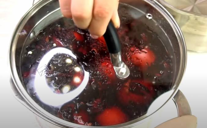 2. Теперь закрываем крышкой и оставляем до полного остывания. Теперь все зависит от вашего пожелания, я люблю насыщенный цвет поэтому оставляю на 6-7 часов, по желанию можно во время окрашивания достать яйцо и оценить устраивает ли вас такая расцветка, если да то можно вынимать уже и через 1 час окрашивания.