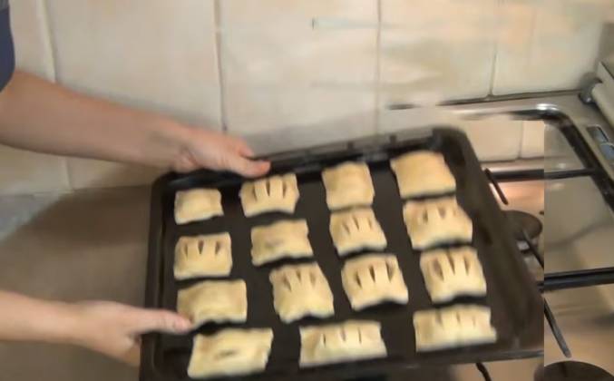 3. Это я так делаю. Думаю, что можно делать как-то по-другому, закрутить начинку. Получается вот такой слоёный пирожок. Продолжаем. Противень смазываем холодной водой. Нельзя смазывать никакими жирами, иначе выпечка потрескается. Мукой тоже нельзя. Только холодной водой. Выкладываем слойки. Оставляем расстояние между ними. Потому что слойки при выпекании увеличиваются в объёме. Ставим выпекать в хорошо разогретую до 220-230 С духовку. На 20-25 минут. Прошло 25 минут. Можно доставать слойки. Они уже готовы. Перекладываем их на тарелку. А на их место отправляем следующую порцию слоек. Я приготовила теста много, поэтому оно у меня осталось. Из оставшегося я сделала сладкую выпечку. Смешала коричневый сахар с корицей. Сделала вот такие вот "ушки". Теперь будем всё вместе выпекать. Немножко смочу противень водой. Выкладываю следующую порцию слоек. Из слоёного теста можно приготовить массу разнообразной и хрустящей выпечки.Видео рецепт ютуб ниже 👇