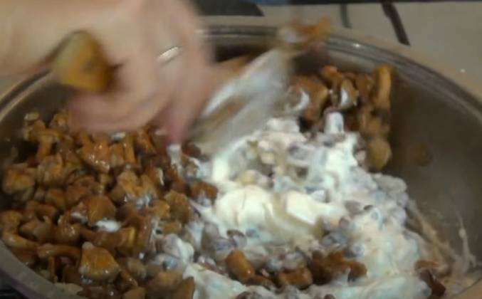 Сегодня речь пойдёт об одной из самых популярных закусок из грибов. Это не просто закуска, а основное блюдо. Лисички в сметане легко и просто готовятся. Берём лисички. Хорошенько их промываем. Их необходимо предварительно замочить, чтобы вся грязь с них сошла. Нам понадобятся: стакан сметаны, соль и пара луковиц.