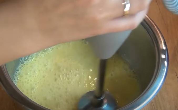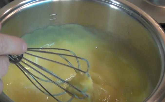 2. Ставим на огонь и доводим до кипения. На среднем огне. Сироп закипел, можно его отключать. Теперь будем взбивать яйца. Взбивать буду в кастрюле, потому что потом буду заливать сиропом. Разбиваем яйца. Берём миксер с насадкой "дисковый взбиватель" для взбивания яичной пены. На второй скорости взбиваем яйца. Этого достаточно. Берём сироп. Сироп горячий. Тоненькой струйкой переливаем к яйцам и размешиваем. Сразу же получается густая масса. Размешали и ставим на огонь. Средний нагрев.