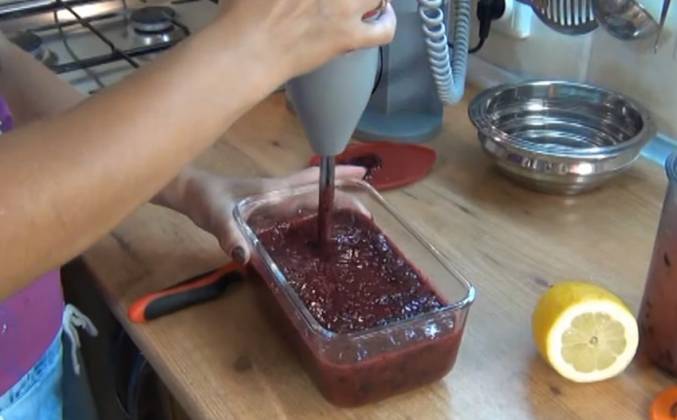 2.  Я приготовила вторую порцию ягодного пюре. Добавлю сюда немного мяты. Для приятного вкуса. Немного лимонного сока. Добавляем по вкусу: можно столовую ложку, можно целый лимон. Кто любит лимон, добавляет побольше. Достаточно. Ещё раз перемешиваем. Переливаем в стеклянный контейнер. Миксером на первой скорости смешиваем оба слоя. Ставим в морозильную камеру замораживаться. При этом, в течение двух часов каждые полчаса будем массу перемешивать, чтобы не образовались крупные кусочки льда.
