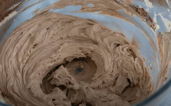 4. Соберите торт. Выложите часть крема на первый корж, разровняйте и накройте вторым коржом. Выложите крем на торт и распределите сверху и по бокам. Оставьте немного крема для декора. Измельчите корж для крошки, и обсыпьте бока торта. Добавьте какао (5 гр) в оставшийся крем, перемешайте и переложите в кондитерский мешок с насадкой.