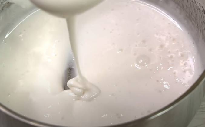 3. Теперь берем сахарную пудру 100 грамм, добавляем 2 стл горячей воды, перемешиваем и ставим на огонь. Как начнут появляться пузырьки снимаем с огня и добавляем подготовленный желатин, перемешиваем и начинаем взбивать миксером до увеличения массы в объёме , побеления и загустения. Примерно вот такая должна получится глазурь.