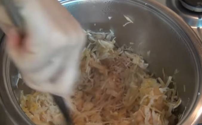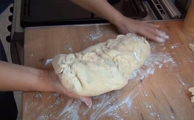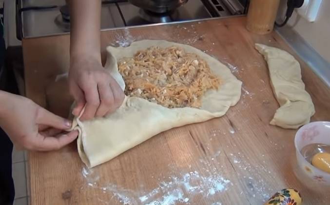 3. Она будет слегка розоватая. Теперь сюда нужно добавить рубленые яйца. Очищаем яйца от скорлупы. Мелко их нарезаем. Добавляем яйца в капусту. Перемешиваем. Получается классическая начинка с моим добавлением томатной пасты. Начинка готова. Переходим к тесту. Тесту нельзя перестаивать, иначе можно испортить всю кулебяку. Она будет или кислая, или горькая. Посыпаем стол мукой. Перекладываем тесто на стол. Берём скалку. Начинаем раскатывать. Раскатываем тесто толщиной 1 см или чуть меньше. Забыла: для украшения нужно оставить немного теста! Сразу отрежу кусочек. Теперь раскатываем. В прямоугольник. Выкладываем на середину теста нашу начинку. Начинки в кулебяке должно быть много. Теперь соединяем противоположные края теста. Не боимся. Слегка натягиваем. Перекладываем аккуратно кулебяку на противень. Швом вниз.