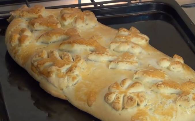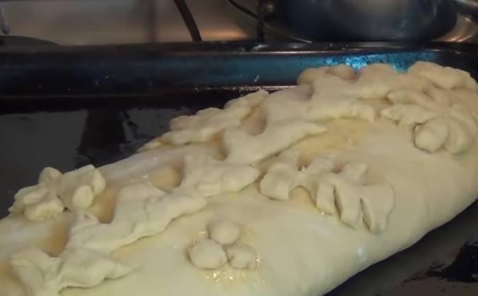 4. Противень предварительно смазываем маслом. Придаём форму батона. Пока всё. Теперь украшение сверху. Тесто немного раскатываем. Чтобы у меня были две полосочки. Каждый оформляет, как душе угодно. Я хочу сделать, сейчас покажу что. Разрезаем на полоски. Теперь делаем такие надрезы по тесту. С обеих сторон. Украшение прикрепляем при помощи яичного желтка. Смазываем желтком верхнюю часть кулебяки. Выкладываем наше украшение, слегка растягивая. Лишнее убираем. Можно сделать различные завитушки, цветочки. Сделаем цветочек. Разрезаем. Так же при помощи яичного желтка прикрепляем к тесту. Слегка распрямляем. Кулебяку мы украсили. Теперь ей нужно немного постоять, чтобы тесто немного поднялось. Тесто постояло буквально 10 минут. Оно слегка приподнялось. Теперь смазываем его яйцом, чтобы оно было румяное.