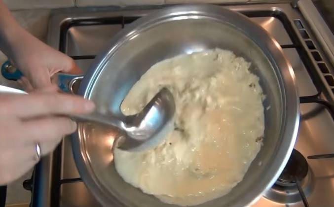 2. Можно готовить в одной ёмкости, чтобы потом не переливать в миску. Тогда не надо будет мыть лишнюю посуду. На мелкой тёрке натираем в тесто сыр, так как блины у нас сырные. Добавляем в тесто соду и перемешиваем. Получается сырное тесто. Оно ещё достаточно густое, чтобы из него можно было выпекать блины. Нужно его будет разбавить молоком до нужной консистенции. Добавим молоко. Потом можно будет добавить муку для большего количества блинов. На разогретую сковороду наливаем немного растительного масла. Берём ложку лука. Слегка обжариваем буквально 10 секунд. На среднем огне.