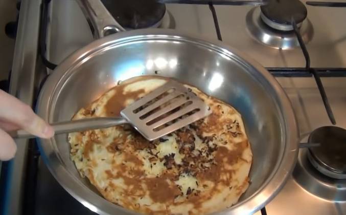 3. Берём тесто и наливаем в сковороду, как делаем обычные блины. Наш припёк останется в середине. Переворачиваем блинчик на другую сторону. Обжариваем его со второй стороны. Блинчик готов. Со второй стороны он тоже румяным получился. Перекладываем его на тарелку и продолжаем готовить остальные блины. Также добавляем немного масла, чтобы слегка обжарить лук. Столовая ложка лука. Обжариваем буквально несколько секунд. Заливаем тесто. "Широкая Масленица, Мы тобою хвалимся, На горках катаемся, Блинами объедаемся!"Видео рецепт ютуб ниже 👇