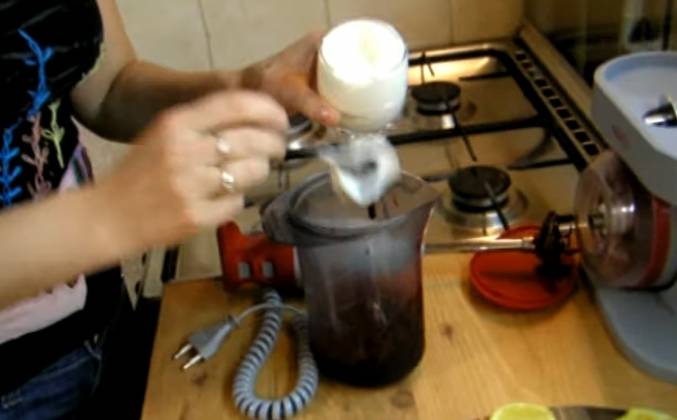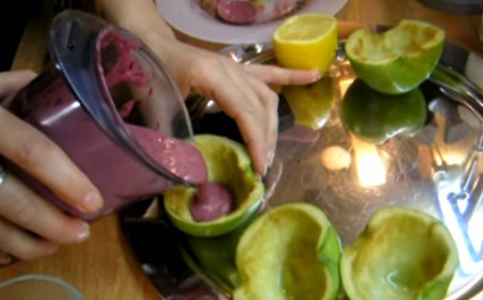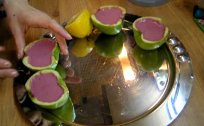 2. Поэтому стараться будем долго. - Ты там ямку выкопала! - Да, ямку копаю большую, чтобы получилась красивая арбузная долька у тебя. У арбуза же зелёная шкурка. Вот и яблочко зелёное я взяла. Получается такая лодочка. Теперь, чтобы яблочко не потемнело, его нужно взбрызнуть лимончиком. - Держи яблочко. Я его полью соком лимона, чтобы оно оставалось зелёненьким и не темнело. А теперь пальчиком. Так нужно сделать со всеми яблочками. Удалить сердцевинку и смазать также. Яблочные дольки у нас уже готовы. Теперь займёмся ягодками. Для этого пересыпаем в стаканчик слегка размороженную чернику. Добавляем сахар. Берём блендер. Надеваем многофункциональную насадку. Такая кривая насадка. Делаем из ягод и сахара пюре. Достаточно. Отключаем. -