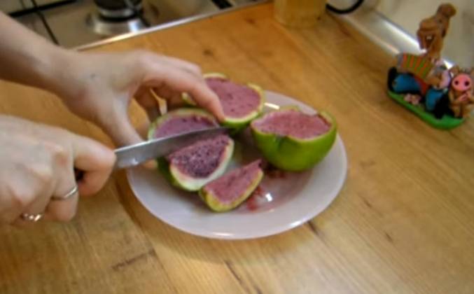 4. Порежем маленькими кусочками. Получились крупные кусочки и стружка. Добавляем их в ягодное пюре. Аккуратно перемешиваем. Блендером не будем, т.к. не будет видно наших красивых кусочков. Теперь нужен желатин. Он уже растворился. Добавляем его в пюре. Перемешиваем. До однородной массы. Разливаем эту массу в яблочные формочки. Чтобы ещё стояли. Не хочет стоять :( Готовые формочки ставим в морозильную камеру до полного застывания. Дольки полностью застыли. Теперь их можно пробовать. Разрезаем вот так ножом. Нарезаем, как яблоко, а получается немного похожим на арбуз. Вот какая долька! - Держи! - Будет вкусно. - И я попробую. Кусай, как арбуз, вот так! - Холодное, но вкусное, да? - Будем кушать?Видео рецепт ютуб ниже 👇