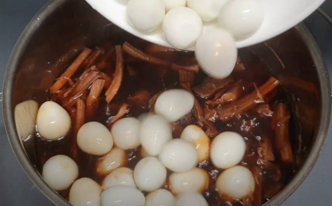 2. Бульон процеживаем, и вливаем обратно в кастрюлю, вливаем соевый соус полстакана (около 150мл), сливовый сироп 1ст.л, сахар 1-2 ст.л, матсуль 3 ст.л, кулинарный сироп 1 ст.л. Опускаем мясо и варим 20 минут, добавляем вареные перепелиные яйца и варим еще 10 минут.