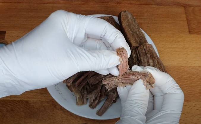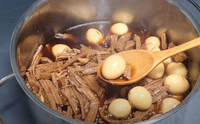 говядина постная, лук, лавровый лист, чеснок, лук порей, матсуль (кулинарное вино), соевый соус, кунжут, сливовый сироп, олигодан (кулинарный сироп), кунжутное масло, вареные перепелиные яйца