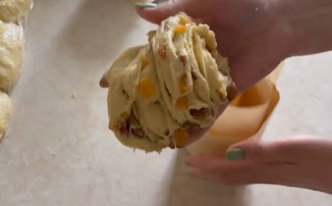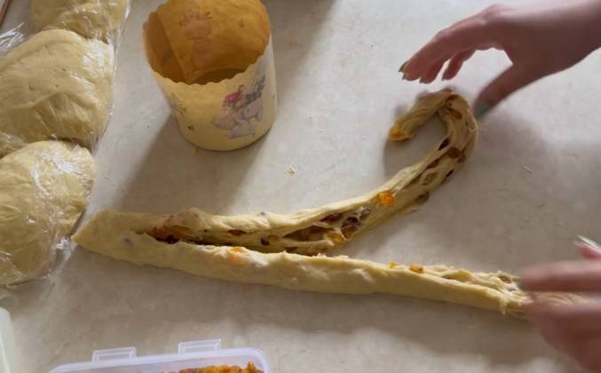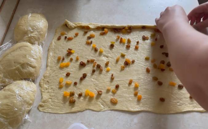 3. Каждую часть раскатать в прямоугольник, смазать размягчённым сливочным маслом, посыпать изюмом и цукатами и завернуть рулетиком. Каждый рулетик разрезать пополам, но не до конца, оставить 1-2 см. Сформировать кулич "улиткой" (все подробности сборки - на видео). Форму с тестом аккуратно перенести в теплое место минут на 30-40. Выпекать при температуре 180С примерно 30 минут, затем убавить температуру до 170С и ещё выпекать 10-15 минут до образования коричневой корочки. Если верх подгорает, можно прикрыть куличи фольгой. Проверяем готовность сухой шпажкой. Декорировать сахарной пудрой💨Видео рецепт ниже 👇