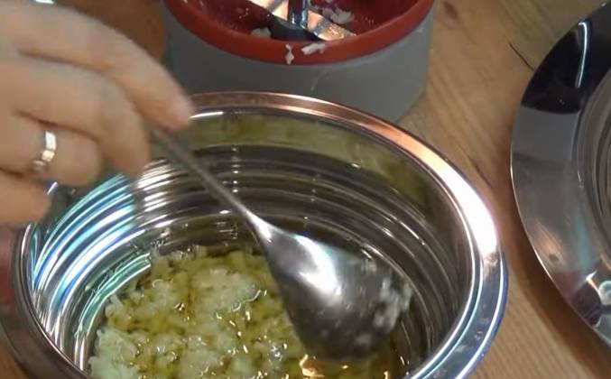 2. Перемолотый чеснок перекладываем в миску. Наливаем полстакана растительного масла и уксус (можно заменить на сок лимона). 2 столовые ложки яблочного уксуса. Добавляем немного соли и перемешиваем. Заправка готова. Перец готов. Удаляем плодоножку и семена. Снимаем шкурку. Перцу нужно дать остыть, т.к. горячий трудно чистить. Очищаем последний перец. Перец готов. В чистую миску кладём перец.