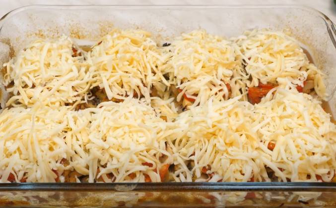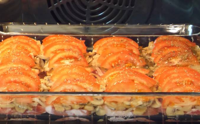 3. Поверх грибов внахлест друг на дружку раскладываем свежие помидоры, нарезанные тонкими ломтиками - у меня 3 средних помидора, общим весом 350 г. Присыпаем сверху сушеным орегано и отправляем в заранее разогретую духовку. Запекаем мясо при температуре 180°C на режиме верхний и нижний нагрев + Конвекция в течение 30 минут. Через полчаса достаем форму из духовки и щедро засыпаем мясо сыром - у меня 300 г смешанного сыра - 200 г из которых Моцарелла и 100 г Голландского. Снова ставим форму в духовку и запекаем еще 10 минут, пока сыр расплавится и станет золотистым.