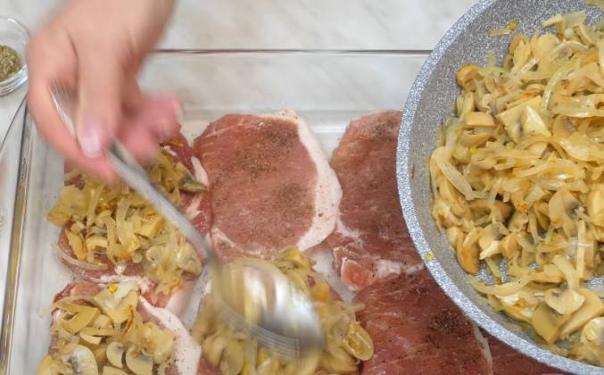 2. Когда лук слегка подрумянится, всыпаем мелко нарезанный чеснок - у меня 4 зубка, перемешиваем и буквально через минуту, как только почувствуете чесночный аромат, добавляем 300-350 г нарезанных грибов - у меня стерилизованные. Грибы можно использовать любые - свежие, замороженные, отварные, консервированные, но не маринованные - они кислые. Не забудьте лук с грибами посолить и поперчить. Если выложить на мясо лук и грибы в сыром виде, то они очень сильно пустят сок, да и потом с обжаренными просто вкуснее. Как только грибы начнут поджариваться, снимаем сковороду с плиты и сразу же в горячем виде щедро выкладываем обжаренные овощи на мясо.