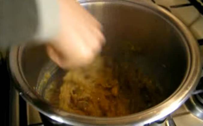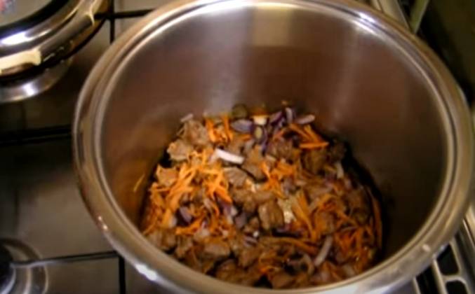 2. Можно сразу же посолить. И поперчить. По вкусу. Достаточно. Перемешиваем и обжариваем на среднем огне в течение 3-х минут. Периодически помешивая. Отставляем в сторону. Высыпаем сюда горох. Нужна водичка обязательно. Наливаем воды немного выше гороха. Вот так достаточно будет. Немного подровняю. Готовить я буду под крышкой-скороваркой. С её помощью горох готовится в 2 раза быстрее. Накрываем крышкой. Поворачиваем её. Скобы прихватили край кастрюли. Ставим на огонь. Включаю самый большой огонь. Следим за индикатором давления - за этим красным флажком. Когда он выскочит вверх - можно убавлять огонь. Красный флажок поднялся вверх и пошёл пар.