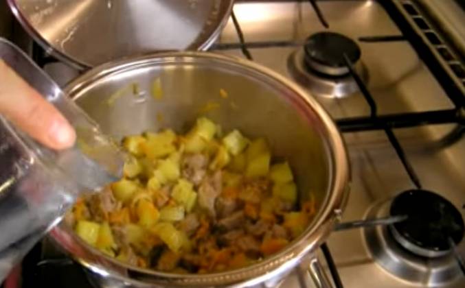 2. И немного поперчить. Смесь перцев. Накрываем крышкой. Ставим на маленький огонь и доводим стрелку термоконтроллера до середины зелёного поля. Пока в кастрюле готовится, я порежу щавель. Режем его просто полосочками. Нарезаем яйца небольшими кусочками. Как на Оливье. Стрелка дошла до середины зелёного поля. Отключаем нагрев. Оставляем настаиваться на 10 минут. Открываем крышку. Получилось овощное рагу с мясом. Добавляем бульон или воду. У меня - вода. Достаточно. Вода и бульон должны быть обязательного горячими. Включаем нагрев. Доводим до кипения, не накрывая крышкой. Перемешиваем. Суп закипел. Добавляем яйца. Огонь не выключаем.
