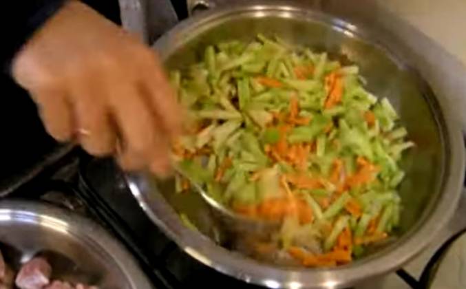 2. Можно открывать крышку. Перекладываем мясо к овощам. Перемешиваем. Нам нужна томатная паста. Добавляем перец. У меня здесь смесь перцев. Солим. Пол столовой ложки хватит. Всё перемешиваем. Нужна вода. Воды добавляю вровень, чтобы вода накрыла все ингредиенты. Всё погрузилось в воду. Накрываем крышкой. На маленьком огне оставляю томиться на 10 минут. Теперь займусь лапшой. Я разогрела кастрюлю. Добавляю сюда кусочек сливочного масла и растапливаю его. В растопленное масло кладу лапшу и слегка её подрумяниваю. Лапша должна пропитаться маслом. Переворачиваем лапшу на другую сторону, чтобы она подрумянилась и с другой стороны тоже. Теперь наливаем воду. Вровень с лапшой. Накрываю крышкой. Оставляю на 1 минуту на маленьком огне, а затем отключаю огонь. Минута прошла.