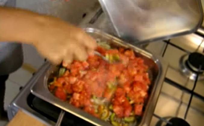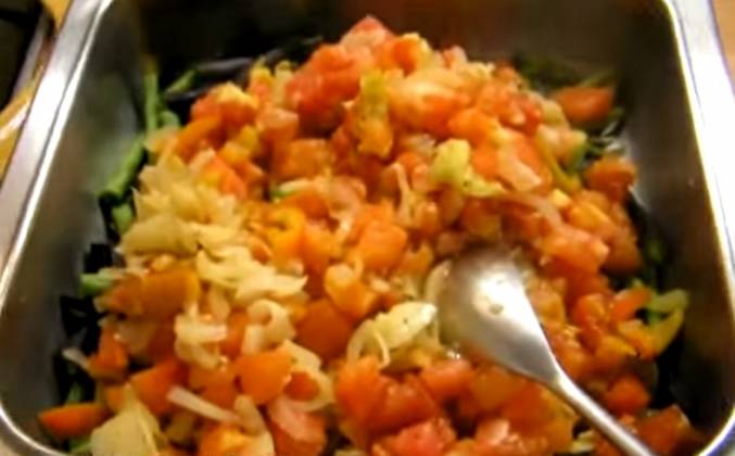 2.  Пересыпаем его в отдельную миску. Берём помидоры. Я помидоры немножко обдала кипятком, чтобы легко снималась шкурка. Теперь она легко снимается. Как у банана. Помидор хороший, мясистый. Теперь будем его резать на кусочки. Берём нож. Нарезаем на кусочки произвольной формы, кому как нравится. Нарезаем помидор. Я люблю кубики. Не забываем помешивать лук. Он уже готов. Добавляем к нему перец. Помидоры. Перемешиваем. Немножко солим. И перчим. Для аромата. Накрываем крышкой. Томим на маленьком огне около 10 минут. Тем временем займусь спаржевой фасолью. Сначала у неё нужно отрезать вот эти хвостики. У меня фасоль двух видов: чёрная и зелёная. Я её всю буду использовать. Отрезаем хвостики: с одной стороны и с другой. Она слишком великовата. Поэтому нарежем её на кусочки длиной 2-3 см. То есть пополам. И в миску. Прошло 10 минут. Открываем крышку. Здесь процесс идёт: всё бурлит, кипит. Переливаем всё в миску.