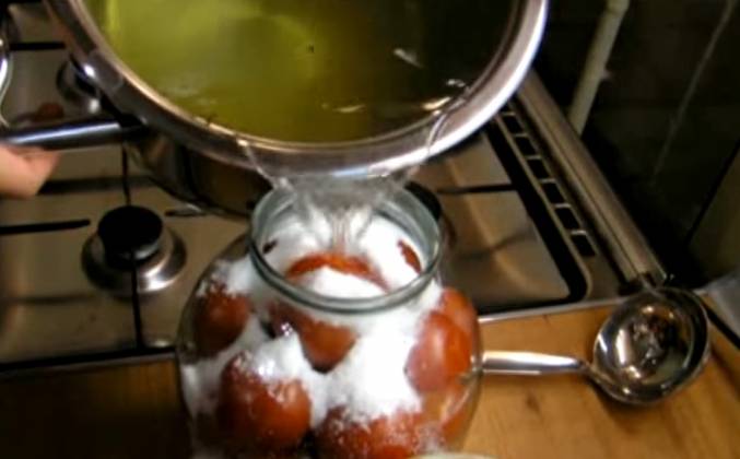 2. Прошло 20 минут. Сливаем воду обратно в кастрюлю, придерживая помидоры. Следующая банка. Рассол окрасился в зеленоватый цвет. Включаем огонь и доводим рассол до кипения. Рассол закипел. Можно в него добавлять сахар и соль. Я сделаю по-другому: соль и сахар добавлю непосредственно в банки. В банку у меня идёт две столовые ложки соли (без горки) и четыре столовые ложки сахара (с горкой). Заливаем всё рассолом. Сахар и соль отлично растворятся, за это можно не беспокоиться. У меня винный уксус. Добавляем 1 столовую ложку. Консервант.