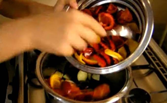 3. Достаём баклажаны. Они хорошо пропеклись, стали мягкими. Теперь следующая порция. Все баклажаны обжариваем таким же способом. Сначала без крышки, потом под крышкой. Баклажаны и помидоры уже обжарены. Будем делать для них заправку. Для этого берём пресс для чеснока. Выдавливаем чеснок. Также чеснок можно порубить ножом. Я решила выдавить. Наливаем сюда растительное масло. Немного уксуса. Перемешиваем. Это, в принципе, вся заправка. Немножко она постоит, минут пять. А я буду укладывать в банки помидоры и баклажаны. Берём банку. Кладём в неё один баклажан и помидор. И так чередуем. Баклажаны и помидоры. Поллитровые банки не очень удобные. Поэтому как получится, так и получится.