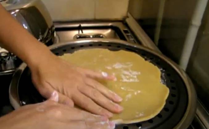 2. Муки понадобится столько, сколько "возьмёт" тесто. Тесто получается тугим, поэтому замешиваем руками на столе. Вот так замешиваем дальше и добавляем ещё муку. Скатываем тесто в заготовку. Тесто получается густым, как на вареники. Делим тесто на 4 части. Из теста делаем шарики. Складываем в миску. Этим шарикам нужно постоять в холоде. Накрываем миску пищевой плёнкой и ставим в холодильник на 20 минут. Тесто остыло. Раскатываем тесто по размеру поверхности для выпекания. Вот такого диаметра. Готово! Будем выпекать! У этой кастрюли нет дна. Устанавливаем её отверстием над конфоркой. На дно посуды наливаем воду. Включаем минимальный огонь. Устанавливаем сверху антипригарную поверхность. Посыпаем поверхность для выпекания мукой. Кладём сверху тесто. Накрываем крышкой.
