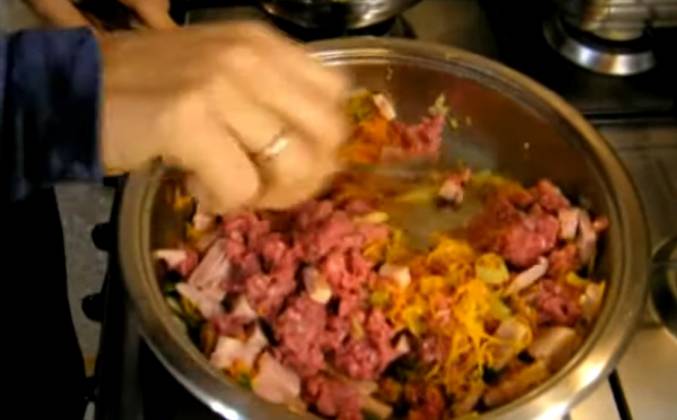 2. Фарш должен обжариться, но не приготовиться полностью. Всё это делаем в течение 10 минут. Мясо готово. Берём помидоры. Помидоры я очистила от шкурки и порезала мелкими кубиками. Перемешиваем. Готовим также на среднем огне. Теперь базилик. Столовая ложка свежего базилика. Базилик придаёт приятный аромат. Обязательно солим. Немного. Думаю, чайной ложечки будет достаточно. В крайнем случаем, мы досолим уже готовое блюдо. Перемешиваем. Чеснок. Мелко порезанный. 3 зубчика чеснока. Сюда же. И напоследок - сухое красное вино. Приятное. Наливаем сюда его. Накрываем крышкой. Тушим всё 20 минут на маленьком огне. - Расскажите, а как с помидоров снять кожицу? Кожица снимается очень легко: нагреваете в миску воду, окунаете туда помидоры минуты на 2-3 и кожица легко, как с бананов, сходит. - Они получаются варёными? Нет, они слегка ошпаренные кипятком. - Спасибо, - Пожалуйста.