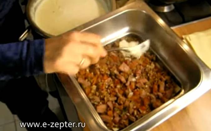 4. Процедура не очень сложная. Главное: всё время помешивать. Помешивая, варим до загустения. В принципе, уже густота появляется. Здесь всё-таки мука. Соус бешамель уже готов. Можно отключать огонь. Дадим ему немного постоять, т.к. у нас ещё готовится мясной соус. Минуты 3 буквально. Мясной соус готов. Отключаем нагрев. Начинаем готовить саму лазанью. Для этого нужны такие листы для лазаньи. Кладём их в подходящую посуду. Квадратная для этого идеально подходит. Запах! Можно уже прям так есть! Но мы всё-таки доведём дело до конца. Можно съесть просто с макаронами :) Немножко перемешаю. Здесь много сока. Наверное для того, чтобы листья лазаньи хорошо пропитались. Кладём мясной соус. Слой мясного соуса. Следующий слой - соус бешамель. Поливаем сверху мясного. Половником это получается намного лучше.