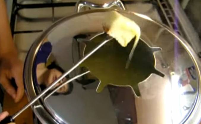 3. Пускай постоит немножко. Берём фондю. Горелку. Обязательно сухой спирт. Сухое топливо. Спички. Зажигаем. Через эти маленькие отверстия. Горелка загорелась. Устанавливаем её. Ставим сверху кастрюлю с сыром. Сюда ещё нужно добавить мускатный орех. Натираем его на тёрке. Буквально щепотку. Солим. Тоже по вкусу. Можно добавить перец. Сыр замечательно стоит на горелке. Горелка не даёт ему возможности подсохнуть. Накрываем крышкой. Теперь идём за хлебом. Достаём наш подсушенный хлебушек. Как раз то, что надо. Теперь будем снимать пробу. Берём вилочку для фондю, накалываем хрустящий хлебушек. Он крепко держится. Окунаем в сырное фондю. Полностью. Чтобы весь хлебушек был в сыре. Даём сыру немножко остыть, чтобы он не был горячим и не обжечься. И снимаем пробу! Очень вкусно! Альпийские пастухи знали толк в еде.Видео рецепт ютуб ниже 👇