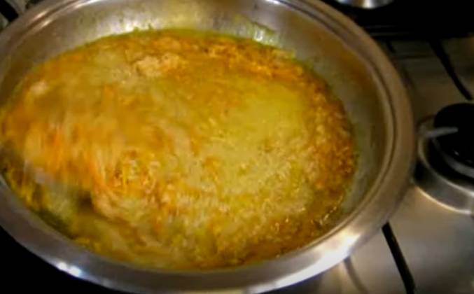 2. Можно добавлять куриный бульон. Доводим всё до кипения. И будем готовить дальше. Бульон закипел. Добавляем немного корицы. Теперь засыпаем сюда кус-кус. Так как в Европе продаётся кус-кус быстрого приготовления, поэтому я его засыпаю сразу сюда. И помешиваем. Всё тщательно перемешиваем. Накрываем крышкой. Убираем с огня. И оставляем на 5 минут.