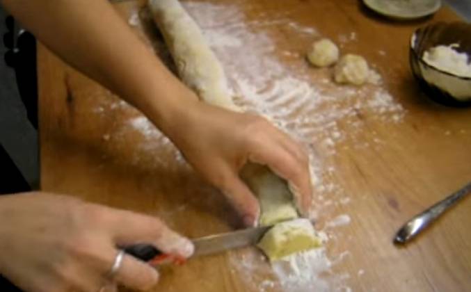 3. Скатываем его в колбаску. Скатать можно при помощи муки. Тогда тесто не будет прилипать к рукам. Берём нож и формируем галушки. Можно оставлять плоскими, можно делать шарики. Кому как нравится. А мы сделаем кружочки. Готовить галушки будем на пароварке. Для этого воду сначала закипятили в кастрюле. На большом огне. Сито-посуду смазываем маслом. Чтобы галушки не поприлипали ко дну посуды. Стеночки тоже. Выкладываем галушки. Оставляем между ними расстояние. Чтобы они друг к другу не поприлипали. Сверху устанавливаем тёрку. Тоже смазываем маслом. Она тоже будет служить пароваркой. И галушки на неё. У меня остались ещё галушки. Чтобы всё приготовилось одновременно, сделаем так: бросим галушки в кипящую воду. Два способа приготовления: на пару и в воде.